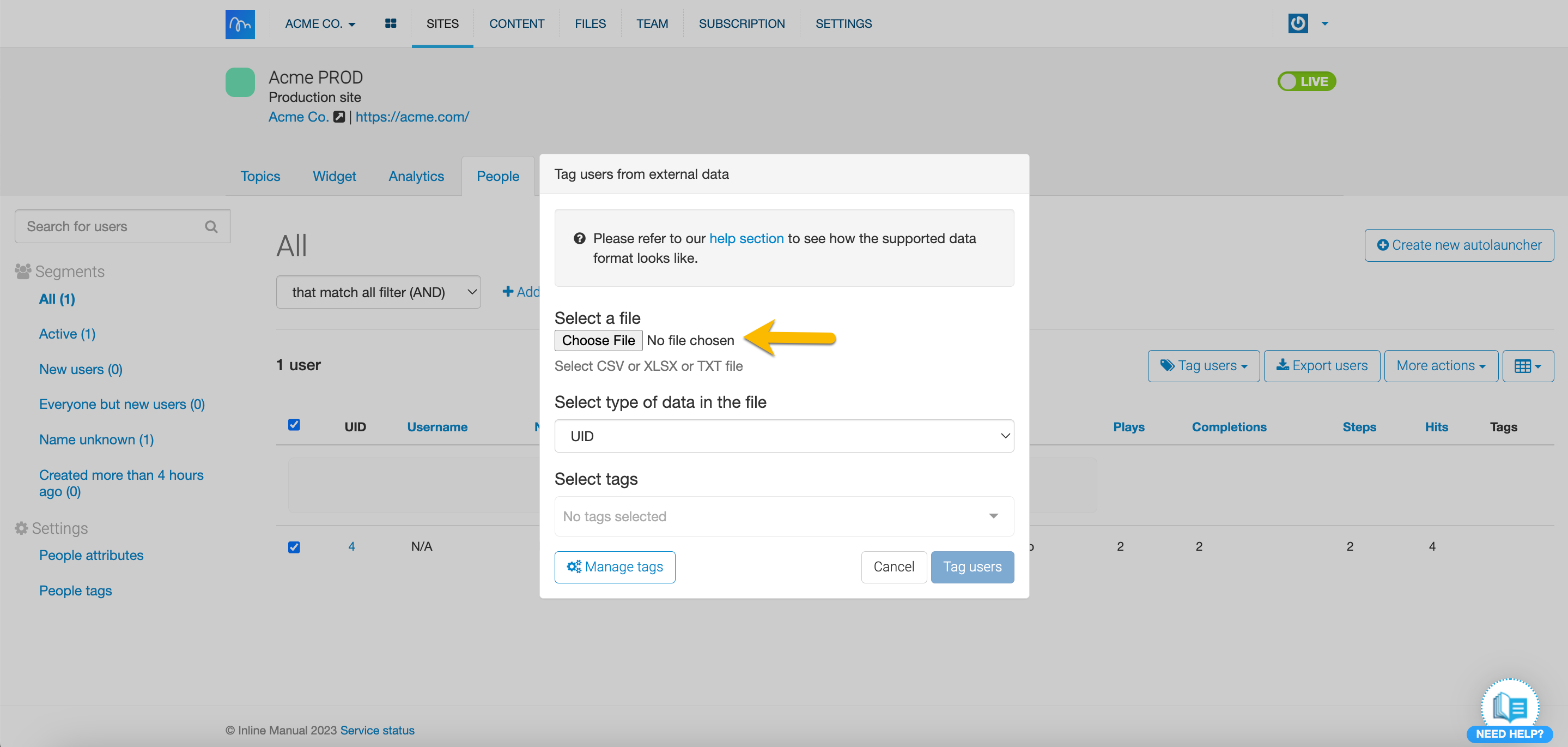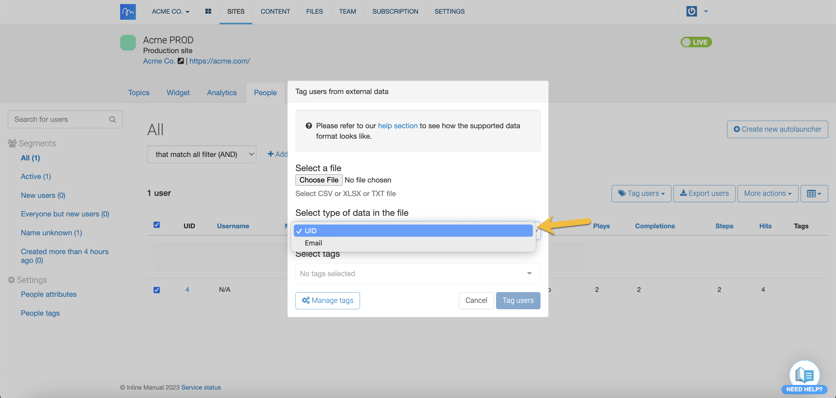 - From the Select type of data in the file drop-down menu, choose either UID or Email.