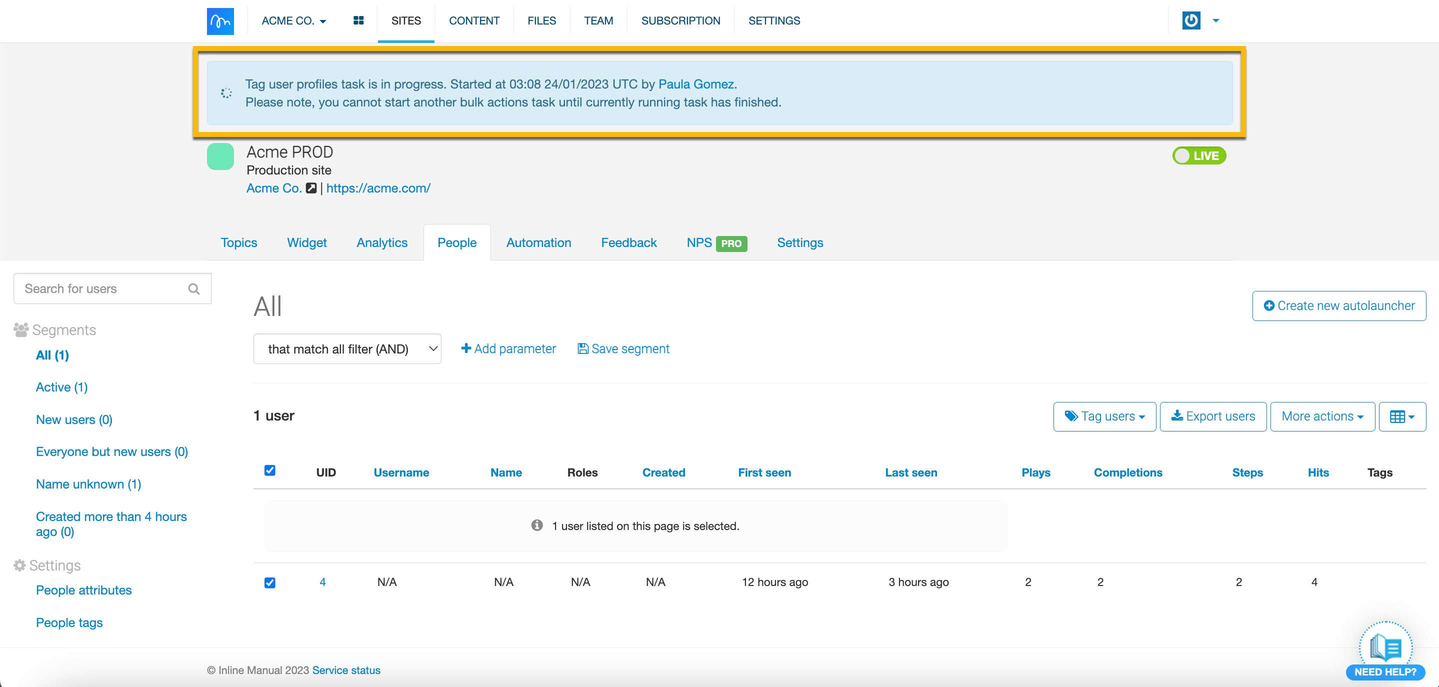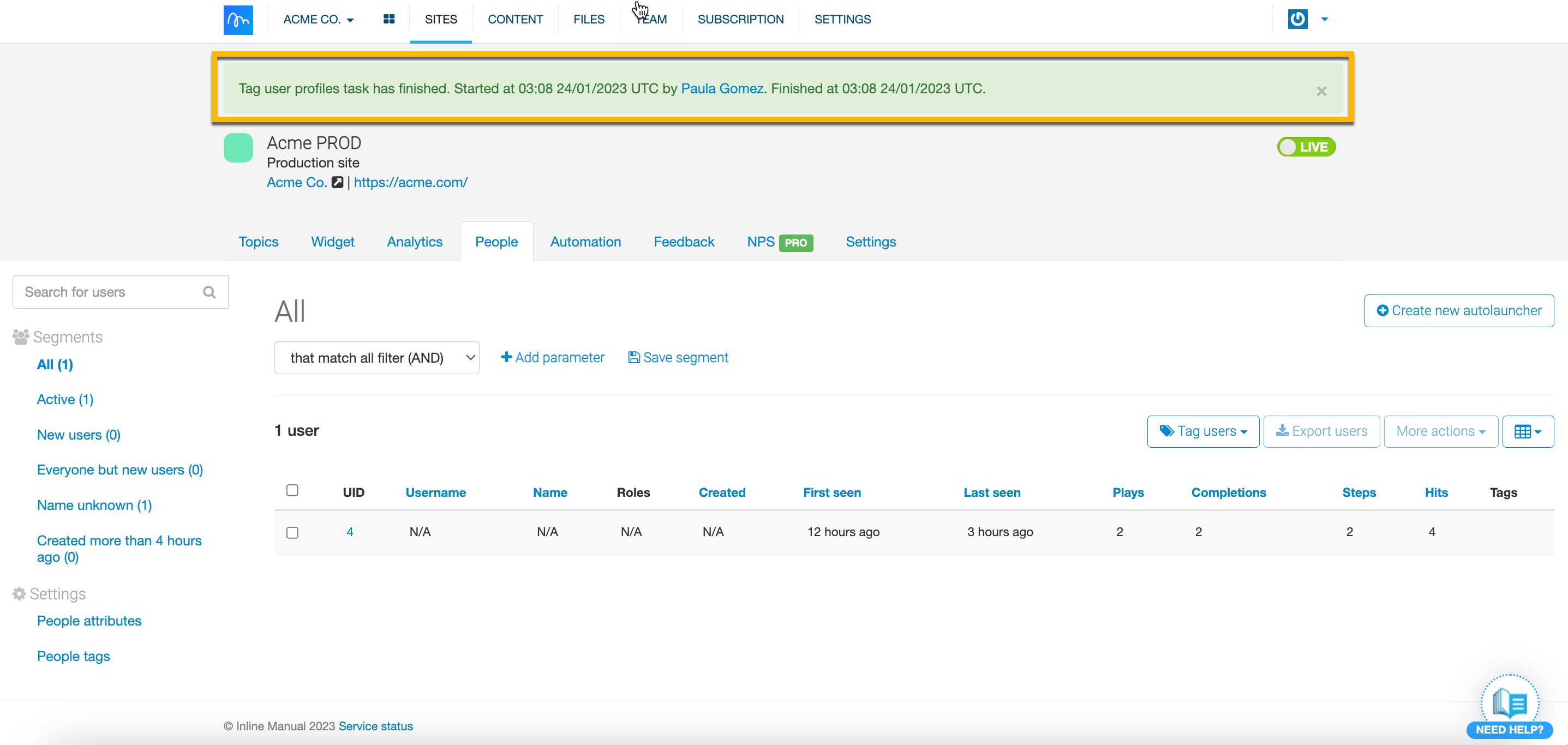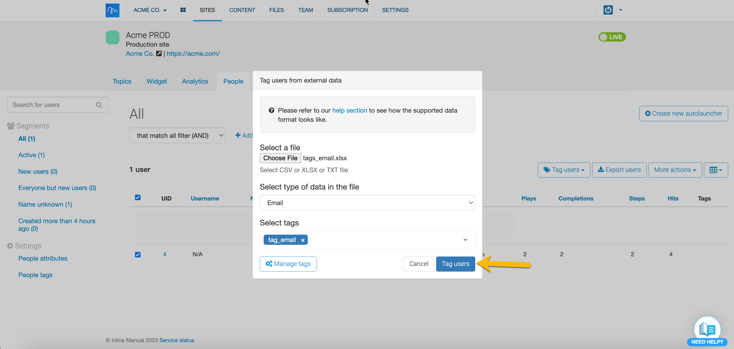 We can achieve this by combining features, including Tags and Autolaunchers. For this guide you will requiere to have people tracking enabled, at least one Feedback and Walkthrough Topic created within your Site, an Autolauncher, at least one Tag and lastly, you will need access to Excel or other Spreadsheet software. Follow the steps below to target users based on Feedback results.