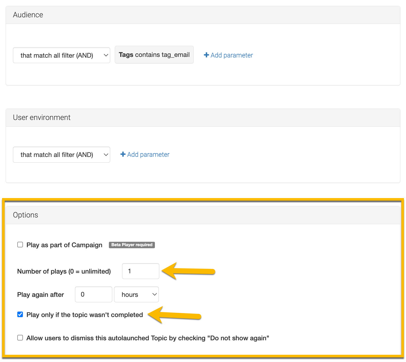 - Also, we would recommend that in the Autolauncher settings, you to limit the Number of plays to 1, as well as setting the Play only if the topic wasn't completed rule.