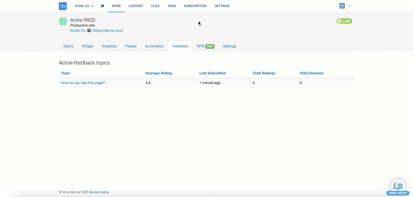 - Go to the Sites tab, choose your desired Site and go to the Feedback tab.