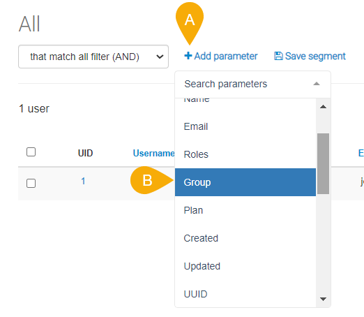 There are several ways to target trial users depending on the data you send to us. You can create a segment by add parameter (A), a Role, a Group (B) or a Plan. Then, the use condition is Trial.