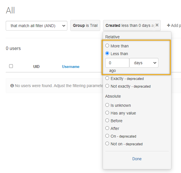 You can then add an additional rule, such as Created and use one of the relevant conditions to provide a time period to, for example, target trial users with accounts that are about to expire.