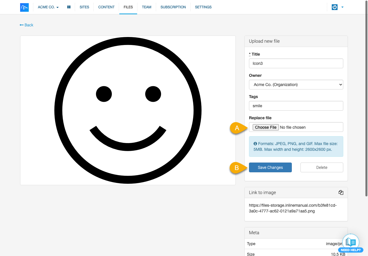 2. Upload the new image by choosing its file in the Replace file section (A) and confirm changes with the Save Changes (B) button.