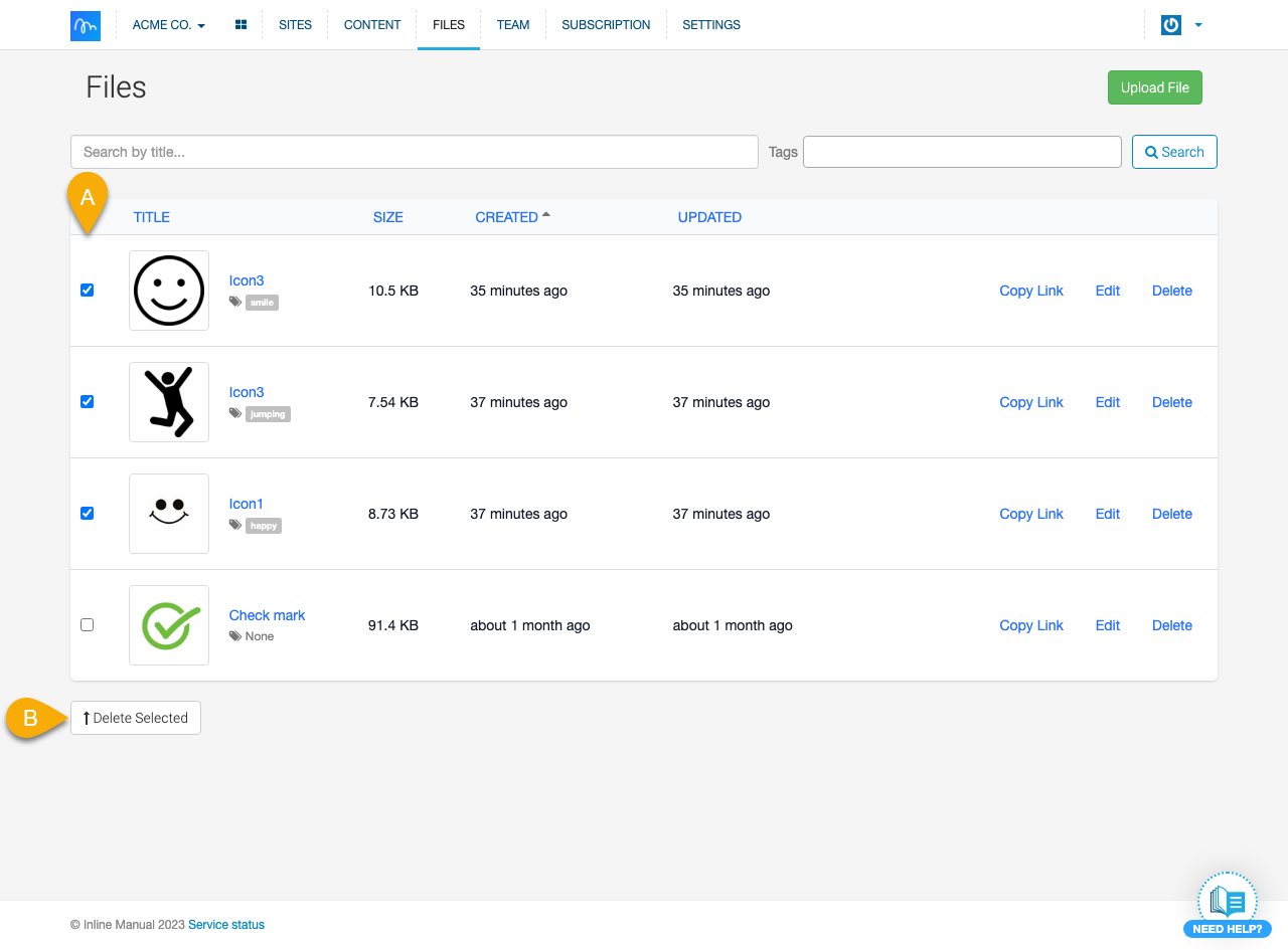 2. If you have multiple files that you want to delete, select them using the checkboxes (A) and delete them all at the same time with the Delete selected (B) button.