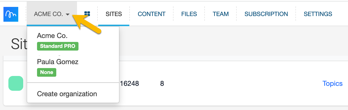 Click the drop-down menu in the upper left corner, choose the paying entity (your personal or Organization account.)