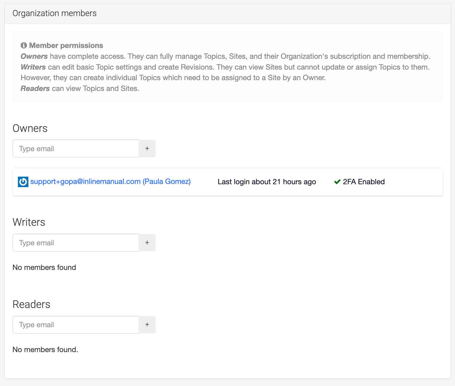 With a personal account, you can create or join multiple Organizations to collaborate with various groups of Inline Manual users. These Organizations you belong to have their own unique members, Sites, and Topics.