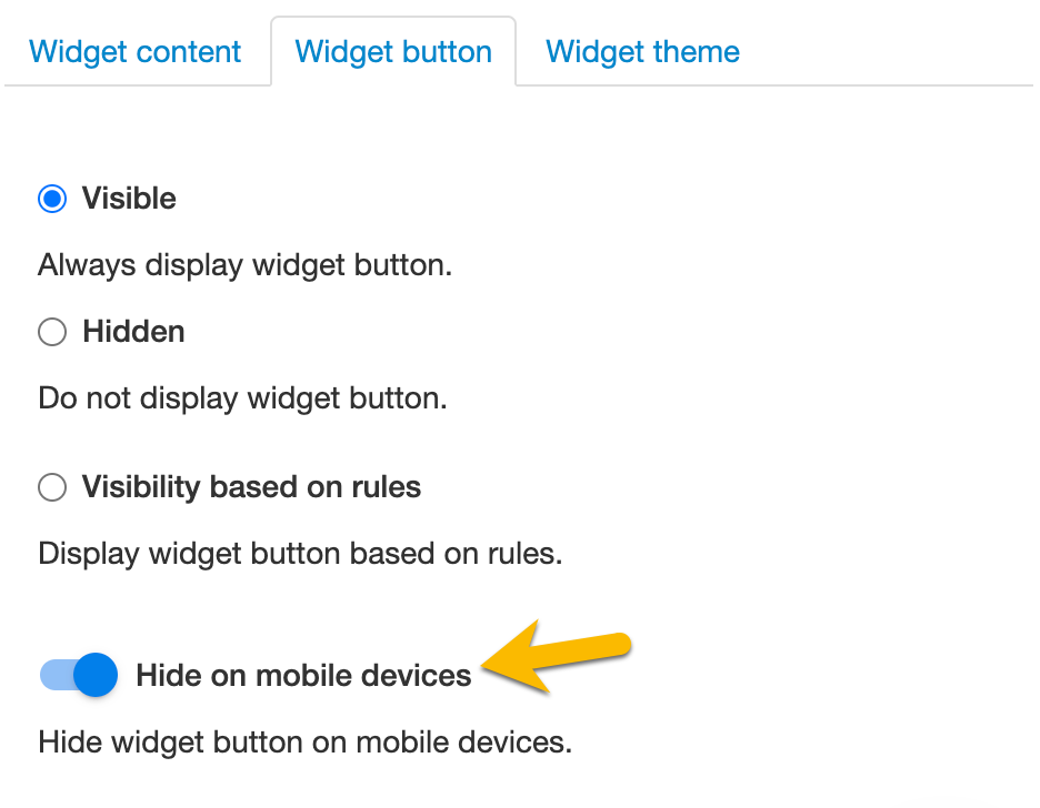- Go to the Widget button tab and toggle Hide on mobile devices.