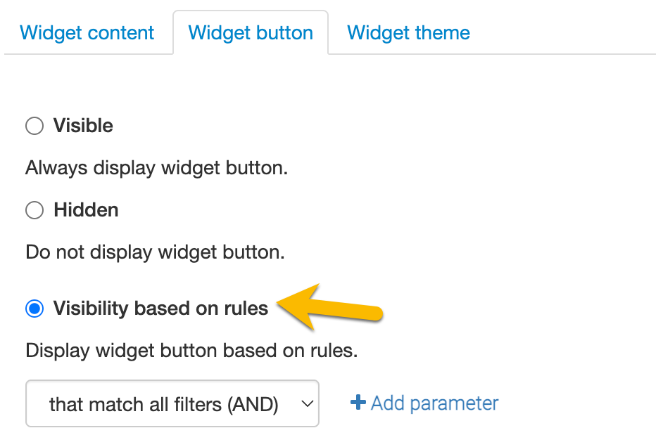 - Go to the Widget button tab and choose Visibility based on rules. You'll see an option to add parameters in the same way you would when building a Segment. This way, you can display a Widget only to a specific group of users.