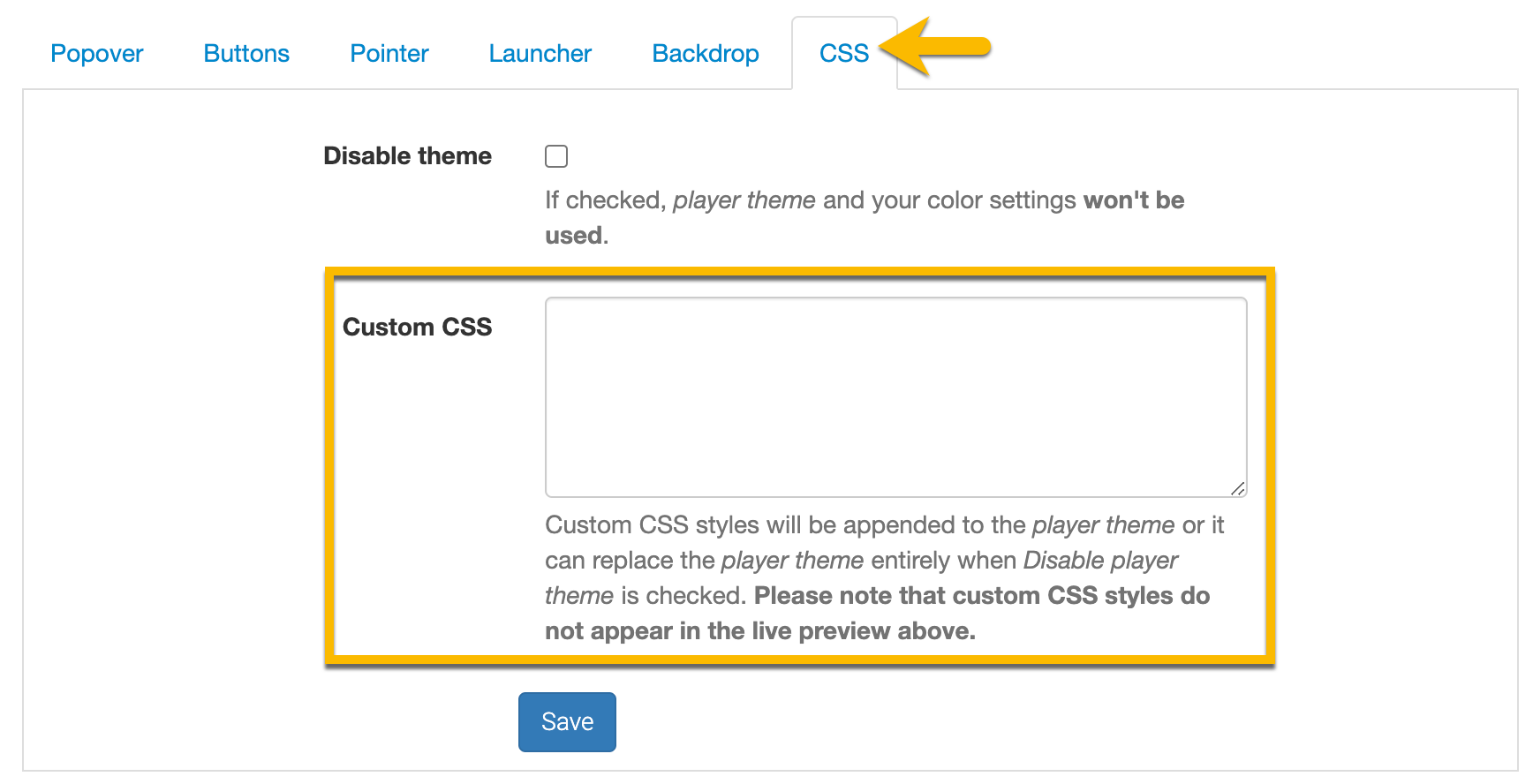 .page-frontpage .inmplayer-trigger { display: none; }You can paste the code under your Site settings > Player appearance > CSS tab or include it as part of your application.