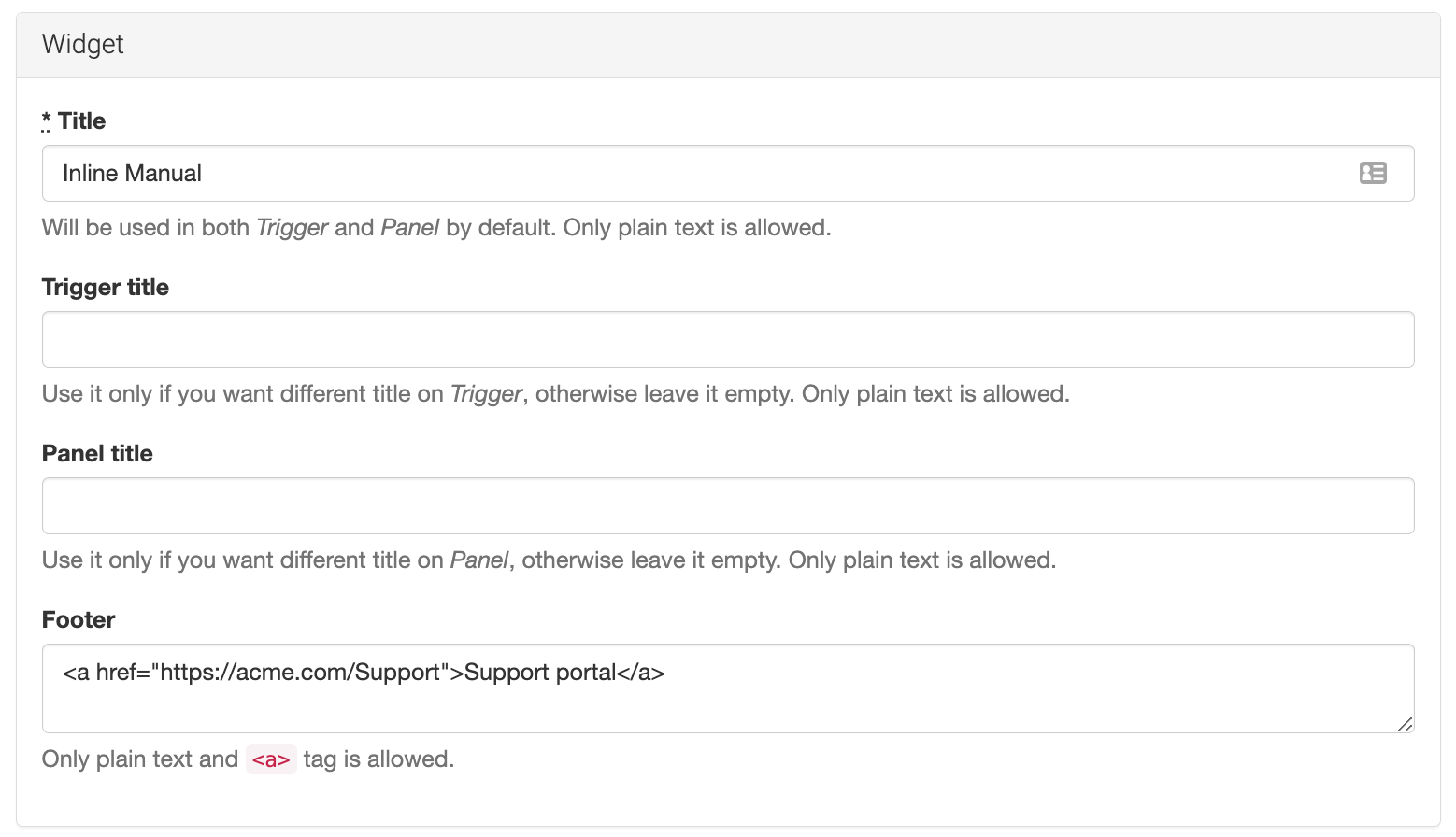 1. Scroll down to the Widget section. In the Footer field, provide the desired link in HTML or plain text if you only want to show a message.