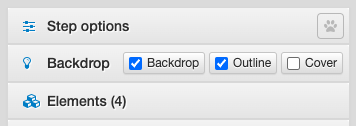 Assign an Element to a Step under the Elements Panel and turn on Backdrop by checking the box next to the Backdrop Panel title. The Backdrop will highlight the selected element or a set of elements. This will make the user focus on the parts of the application you are mentioning in your Step’s content.