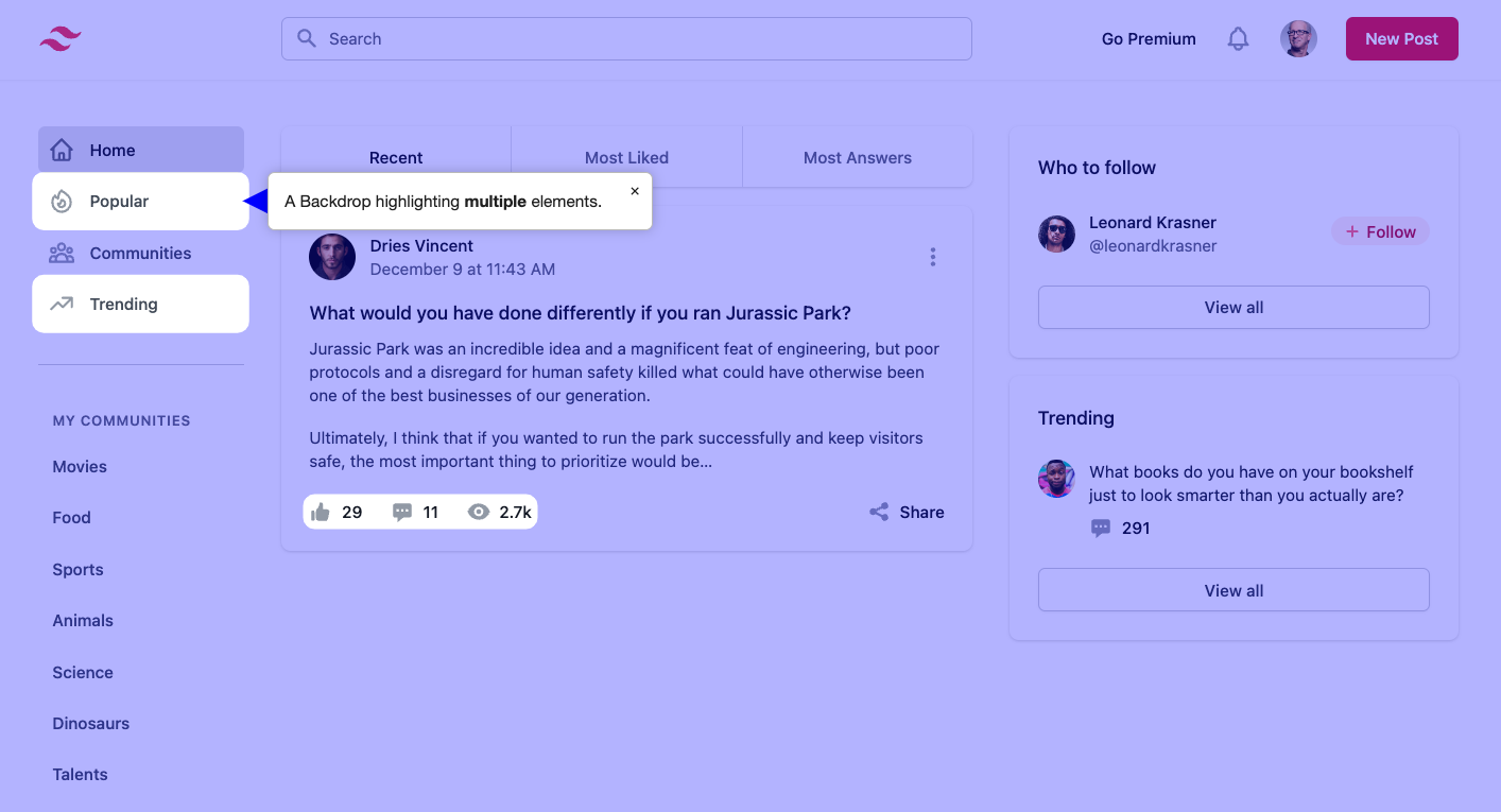 A backdrop appears behind steps or widgets displaying contextual and actionable content. By making use of the Backdrop feature you will be able to help your users focus and redirect their attention towards the next steps. In this article, we'll describe all the Backdrop features and show you how to use them.