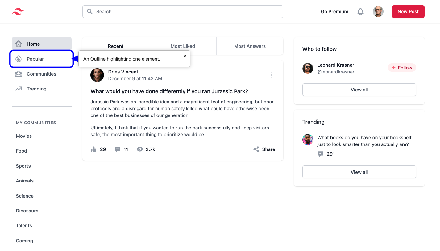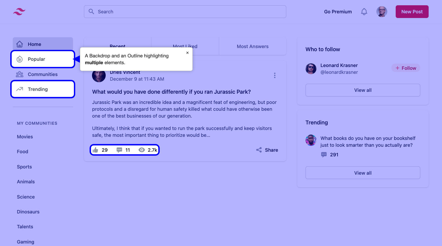 You can turn on the Outline, but that will not prevent the user from clicking on the other parts of the application. Next, turn on the Backdrop, which will add the overlay and reduce the opacity of the Backdrop to 0 (zero). This will show the same as in the image above, but this time, the user cannot interact with anything other than the outlined element.