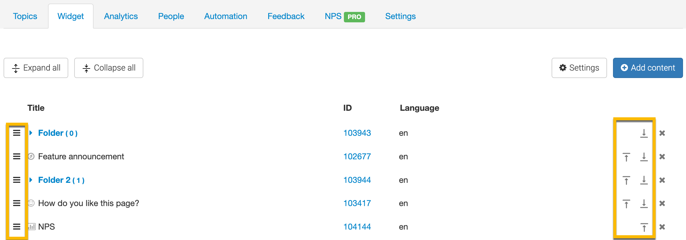 You can drag and drop the Topic in the Widget tab using the hamburger icon (the icons highlighted in the screenshot below to the left side of the screen.) You can use the arrows if you want to move a Topic to the top or bottom of the list (these arrows are highlighted in the screenshot below to the right side of the screen.)