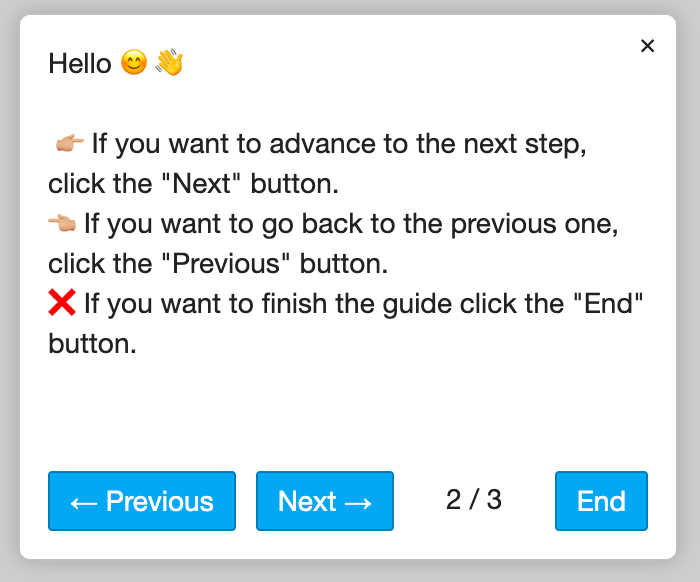 You can also change the text visible on your buttons in the Inline Manual portal. This applies only to the default buttons - Next, Prev, and End.