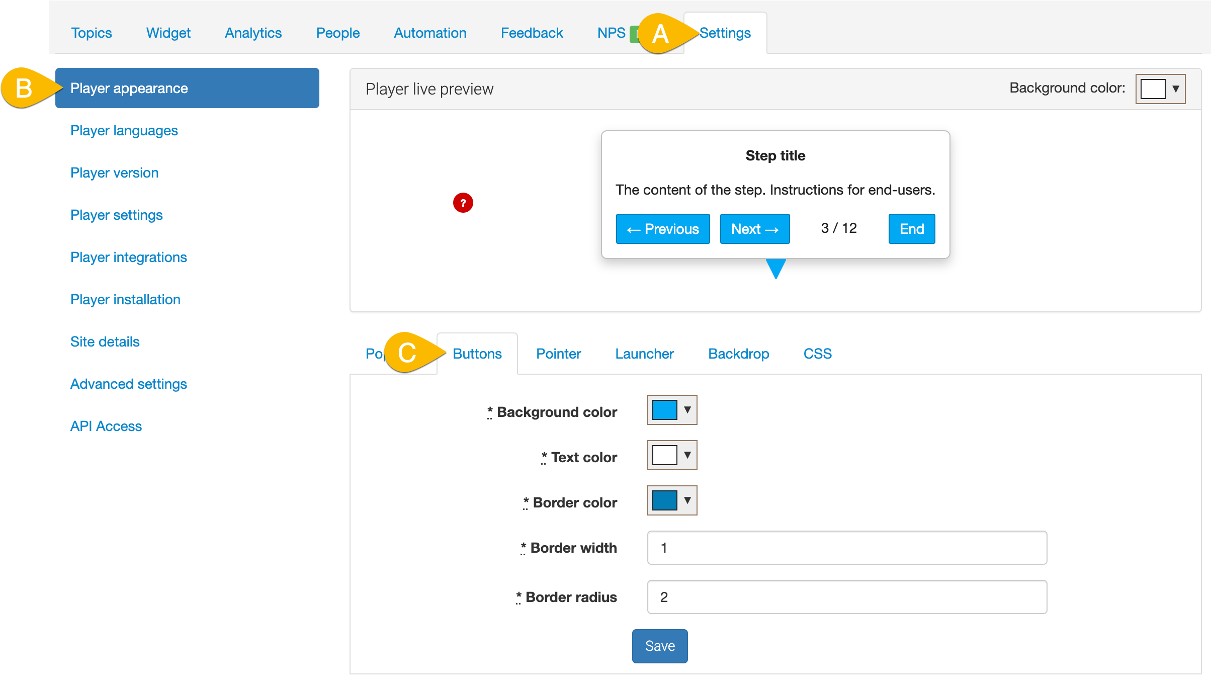 Go to the Settings of the Site (A), then Player appearance (B), and click on the Buttons tab (C). In this tab you will see the option to customize your buttons. Make your changes.