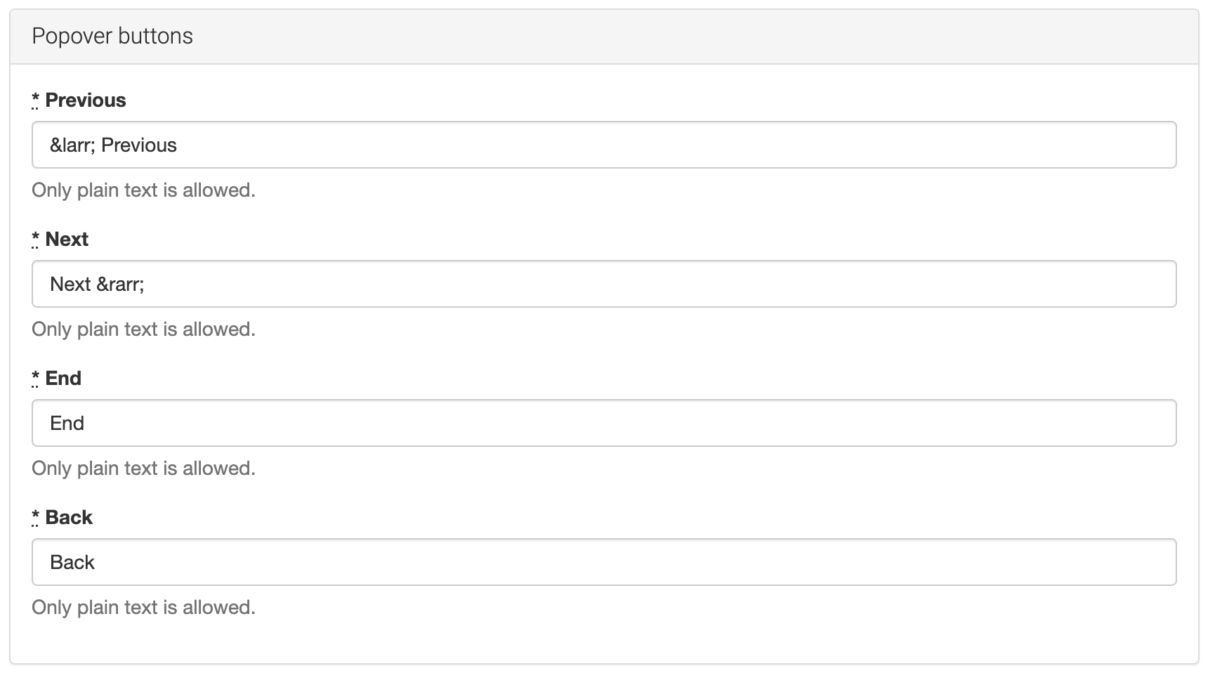 It will open a section with texts visible in different parts of the Inline Manual player. Scroll down to the Popover buttons section and make your changes, e.g. you can change "End" to "Finish" if that suits your application better.