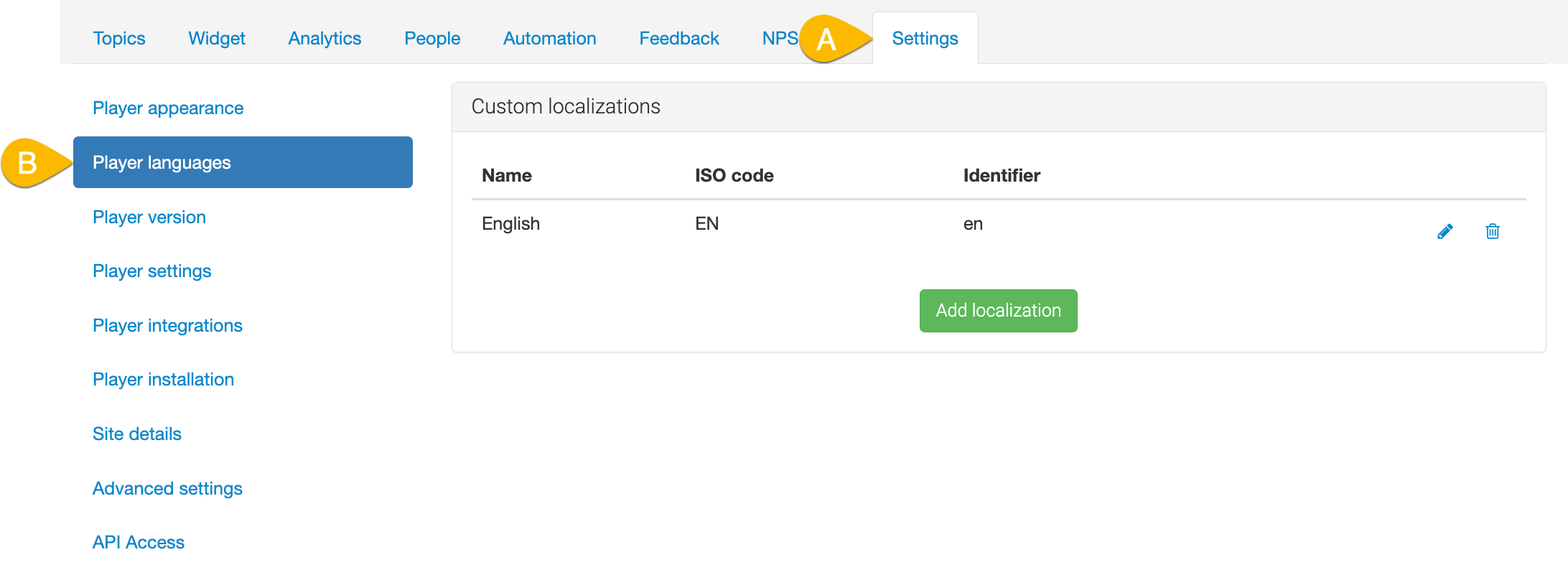- Go to the Settings tab (A) and then click on Player languages (B).