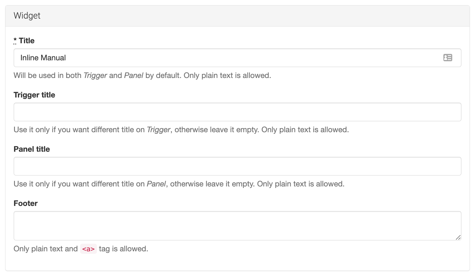 - Panel title - the title of the open Widget. Use it only if you want different titles for minimized and open Widget, otherwise leave it empty. Only plain text is allowed.