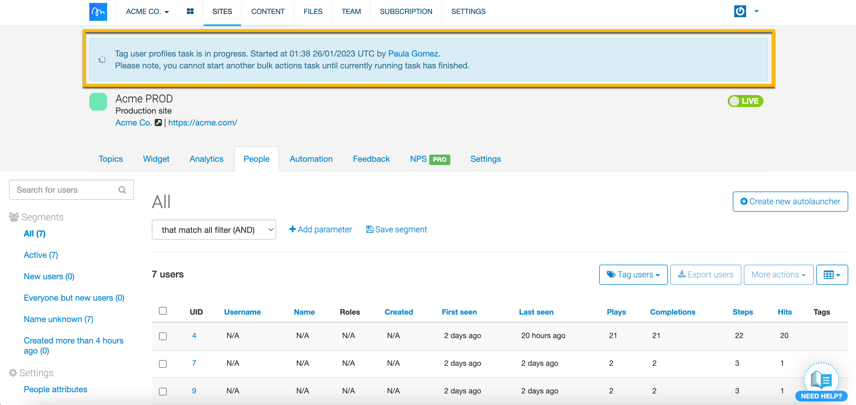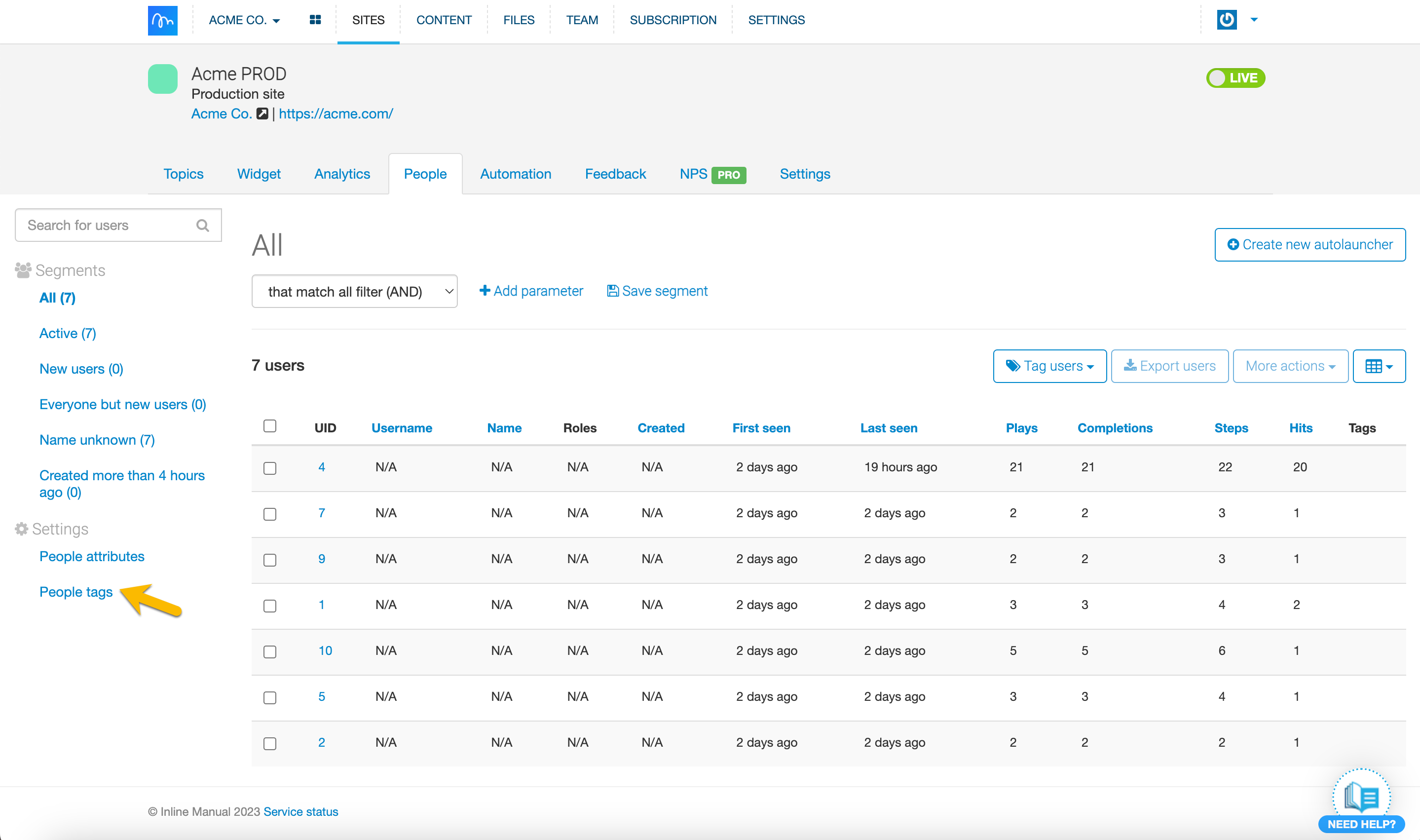 These users should already be under the People tab, as you're not importing users, just tagging them. Currently, you can only tag users based on Email or UID values. If you are going to use emails, the email has to be shared with Inline Manual as part of the email field in People tracking. If the users do not match the profile (they are not under the People tab already), they won't be tagged.