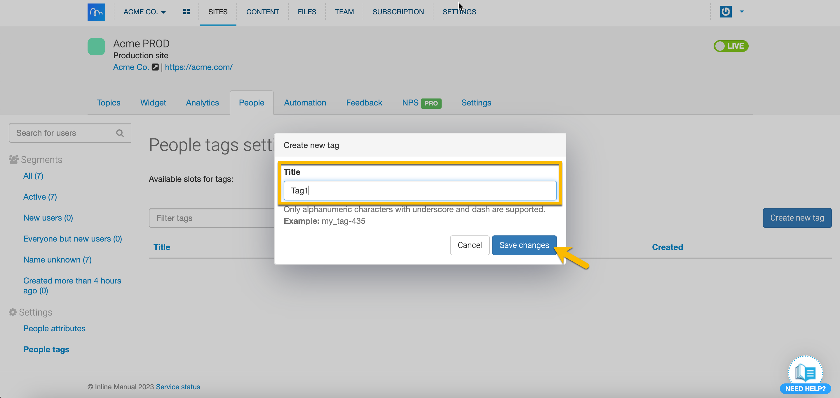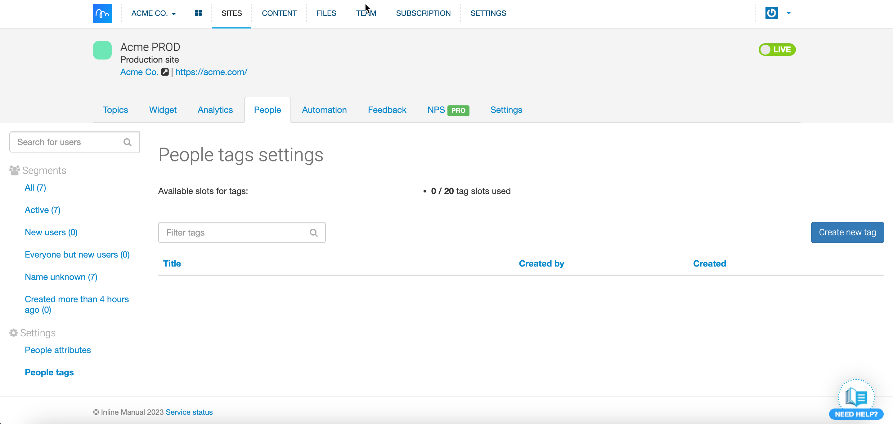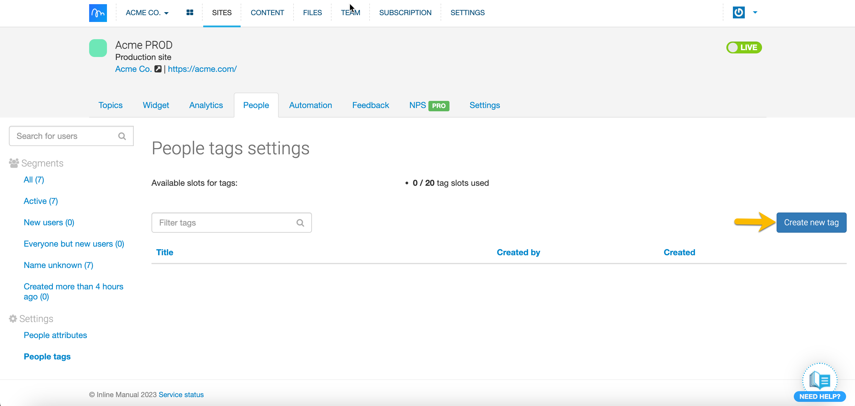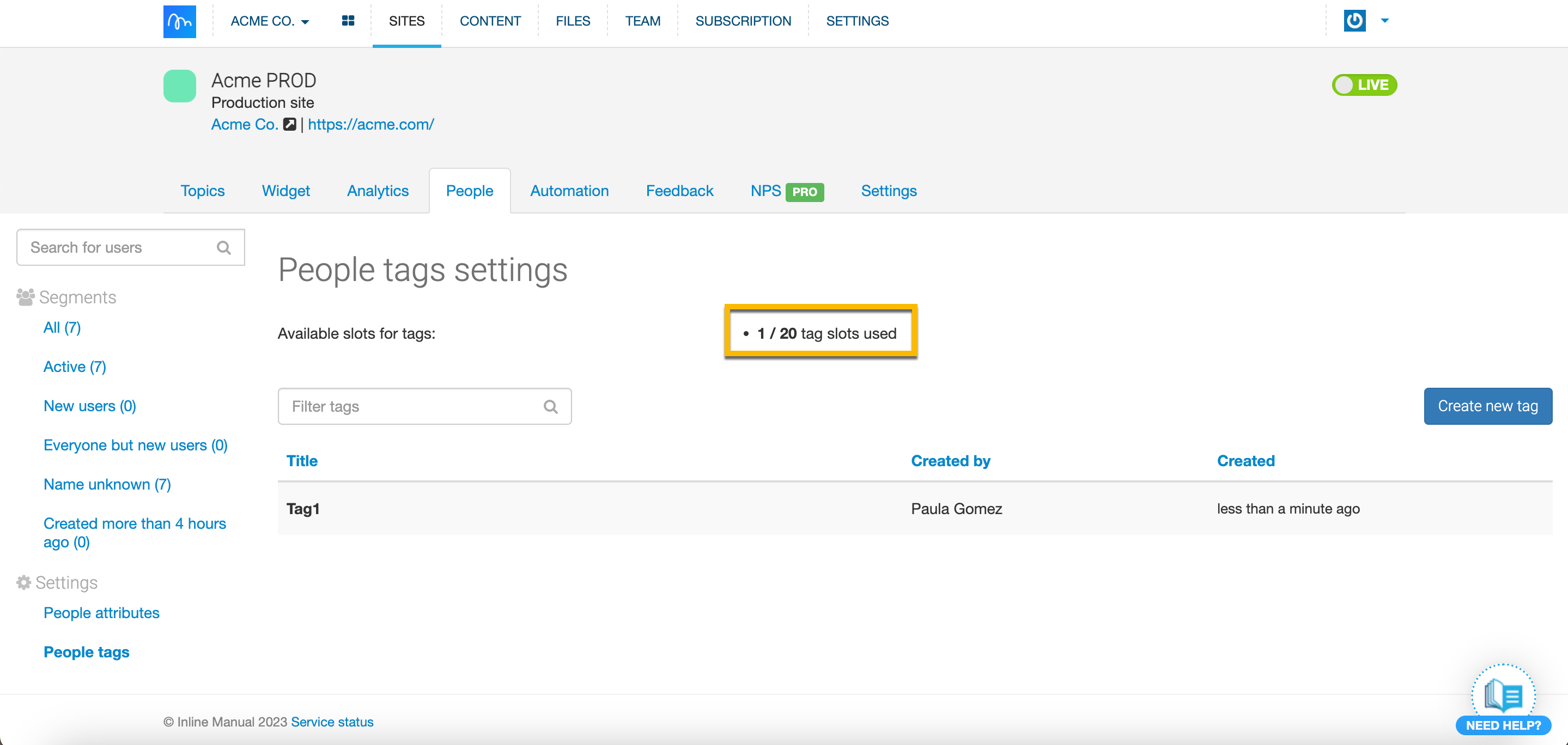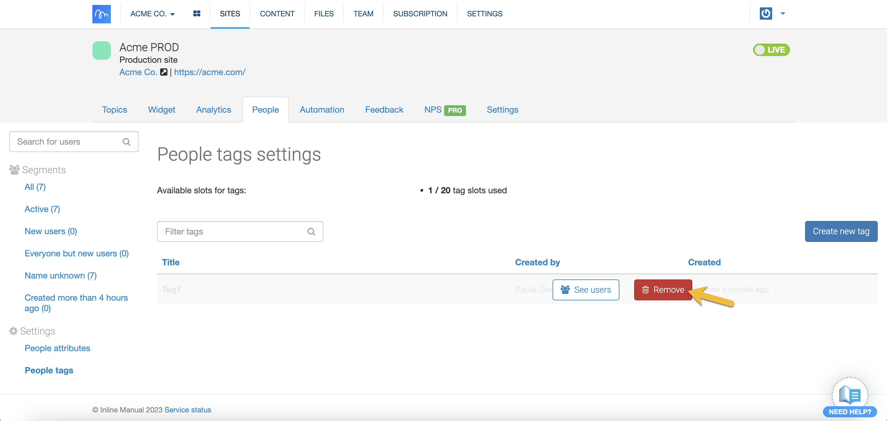 - You'll be redirected to the People tags settings page. Here you can add new tags, remove existing ones, and see how many free slots you have left for tags.
