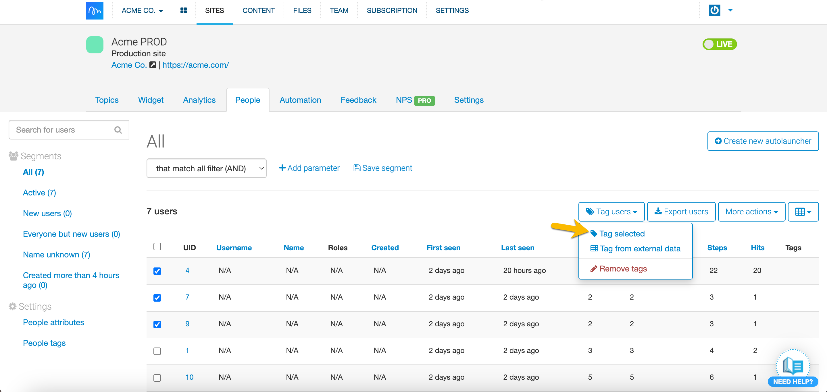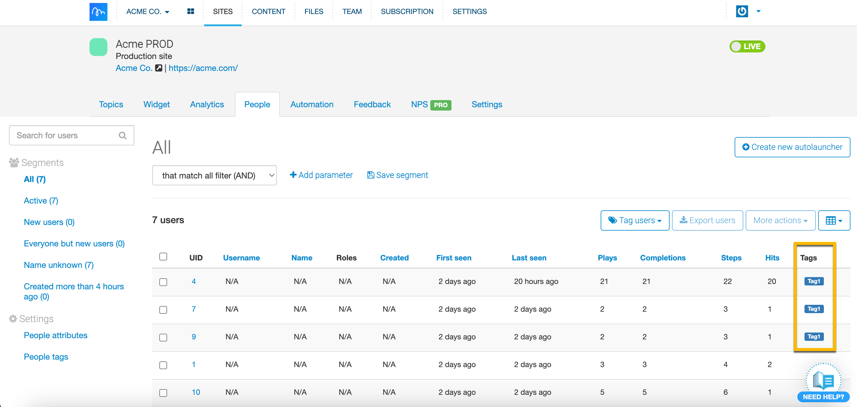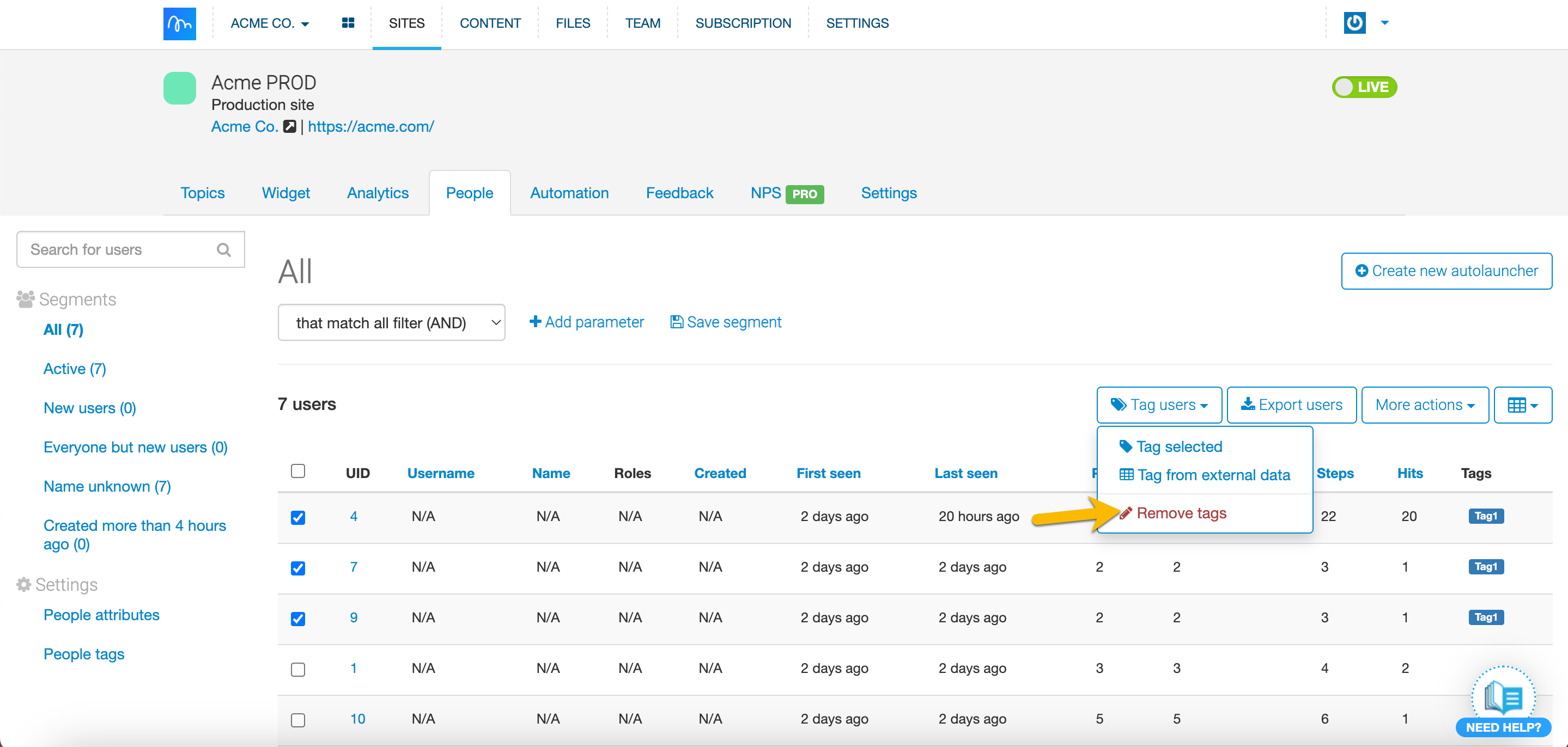 With Tagging, you can quickly tag chosen users and use those tags later on as a parameter to create a particular Segment. You can tag users already tracked within the People tab either within a tab itself or with a file. Use tags to better Segment your users and target them more accurately. Tags are great for highlighting and targeting specific customers - they should be specific to your product. You can use tags not only to create specific Segments but also when you’d like to exclude certain users from a Segment. We're sure you'll find them helpful!