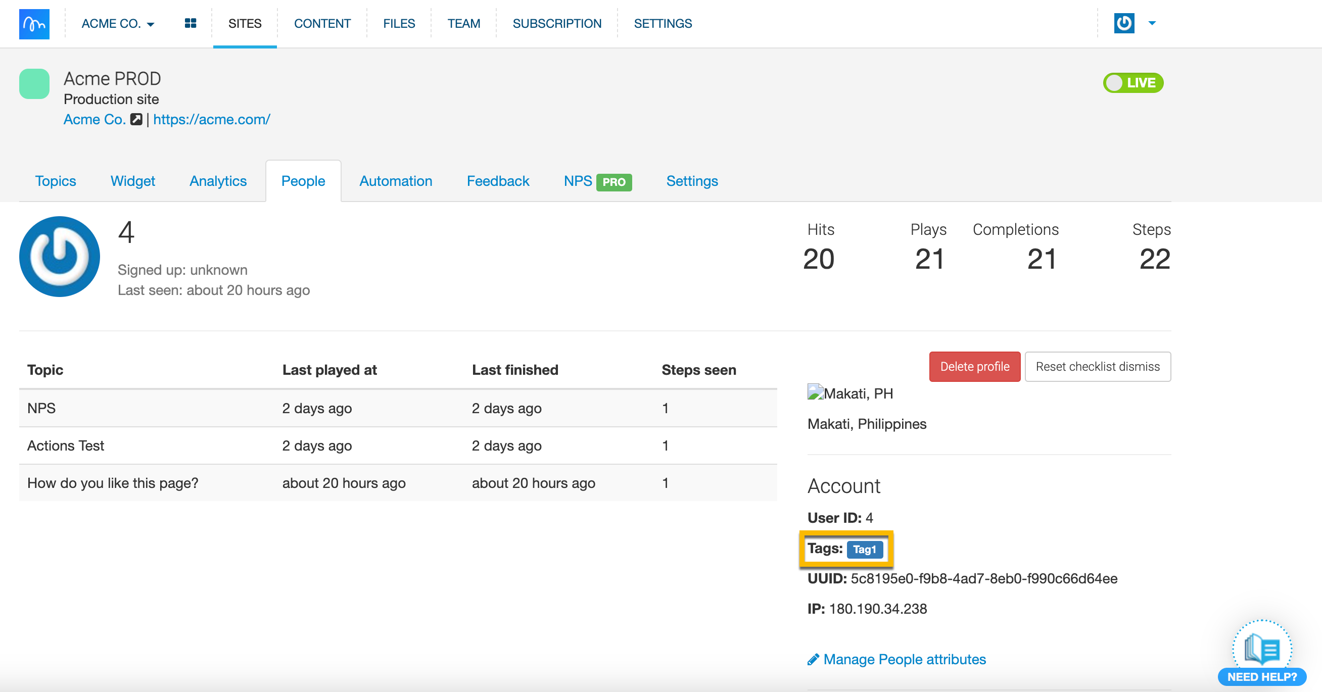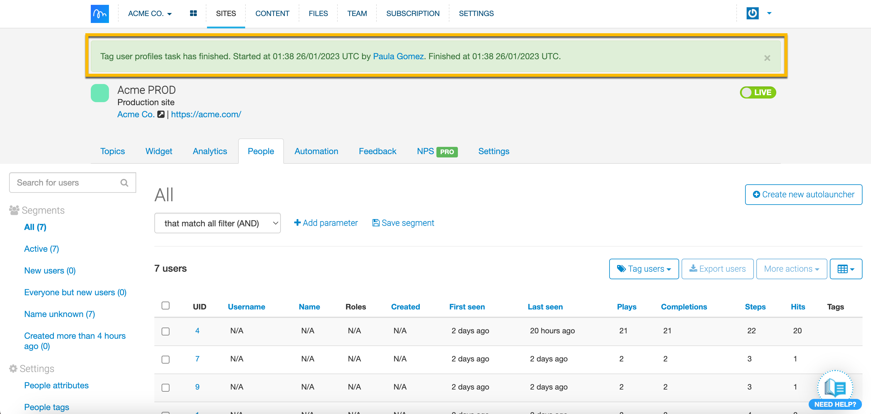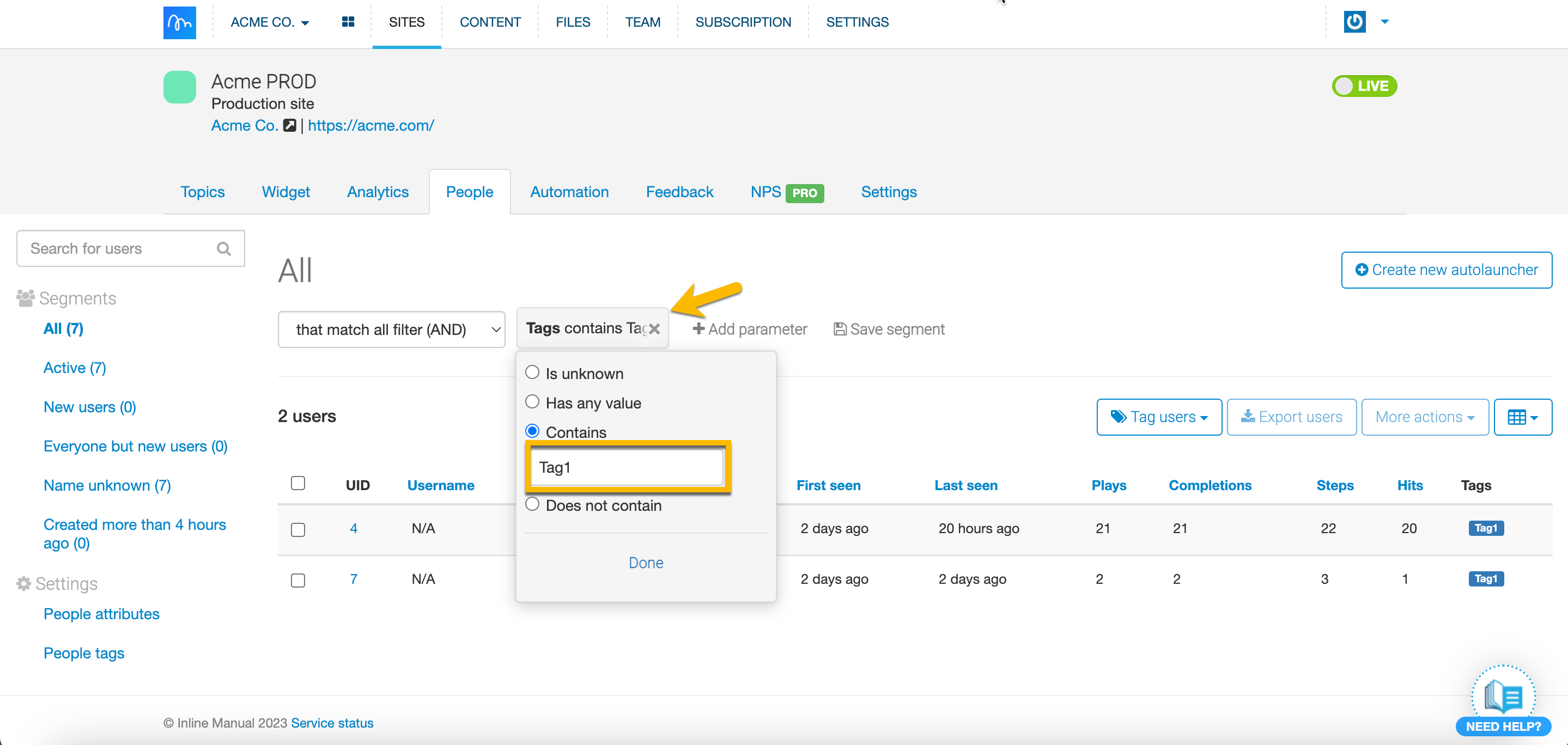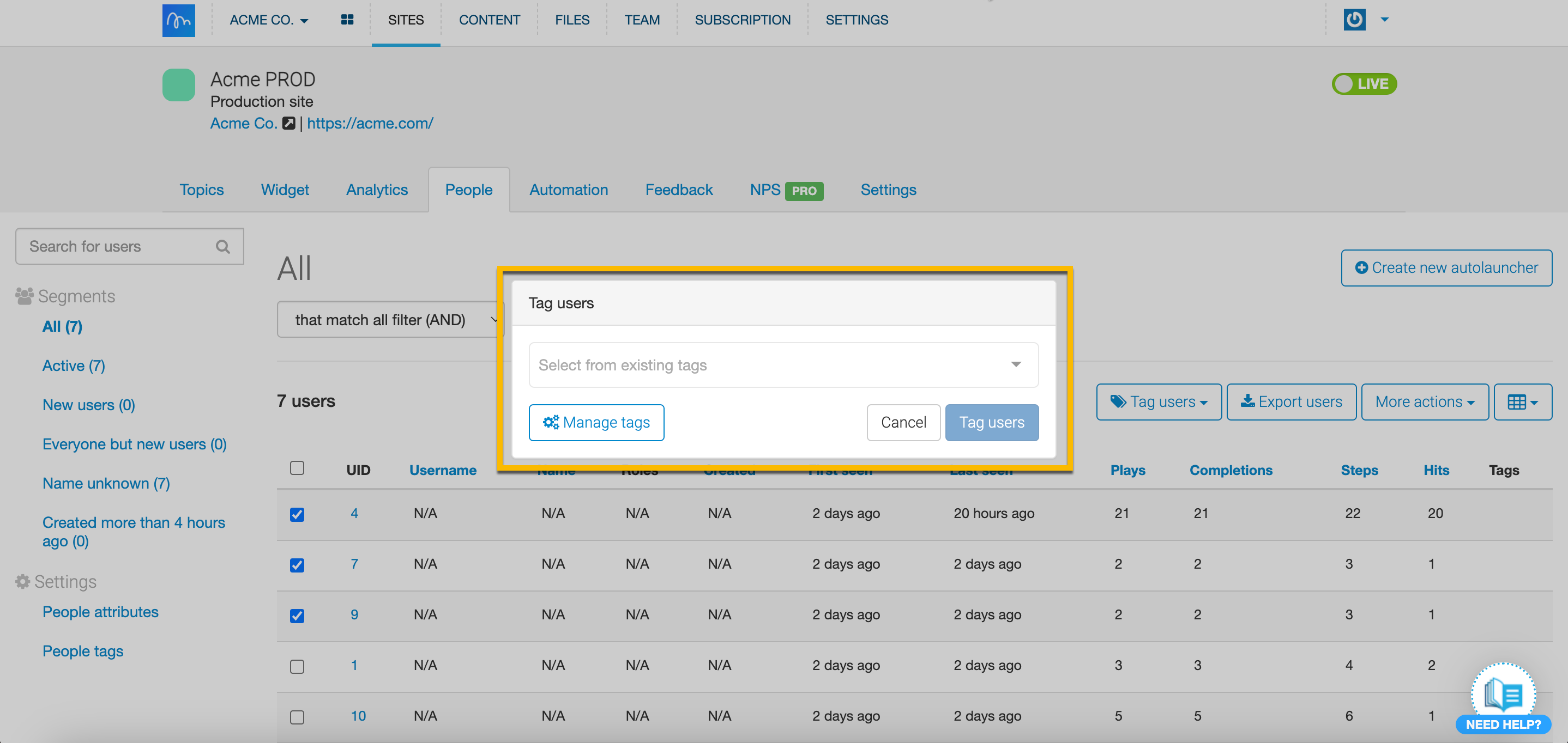 With Tagging, you can quickly tag chosen users and use those tags later on as a parameter to create a particular Segment. You can tag users already tracked within the People tab either within a tab itself or with a file. Use tags to better Segment your users and target them more accurately. Tags are great for highlighting and targeting specific customers - they should be specific to your product. You can use tags not only to create specific Segments but also when you’d like to exclude certain users from a Segment. We're sure you'll find them helpful!