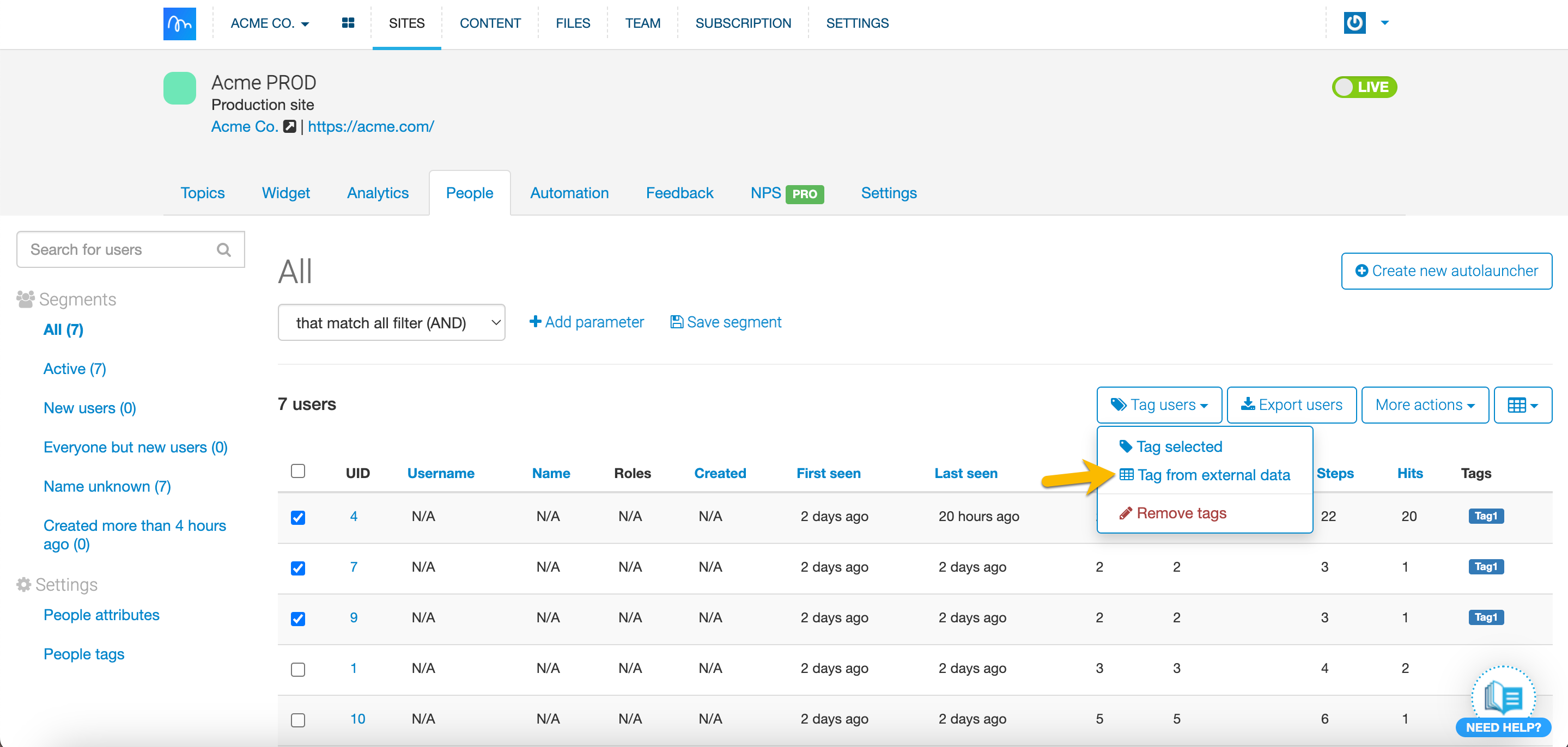 - Once you have a file, in the People tab, click the Tag users button and select Tag from external data from the drop-down menu. This option will be disabled if you don't have any tags added.