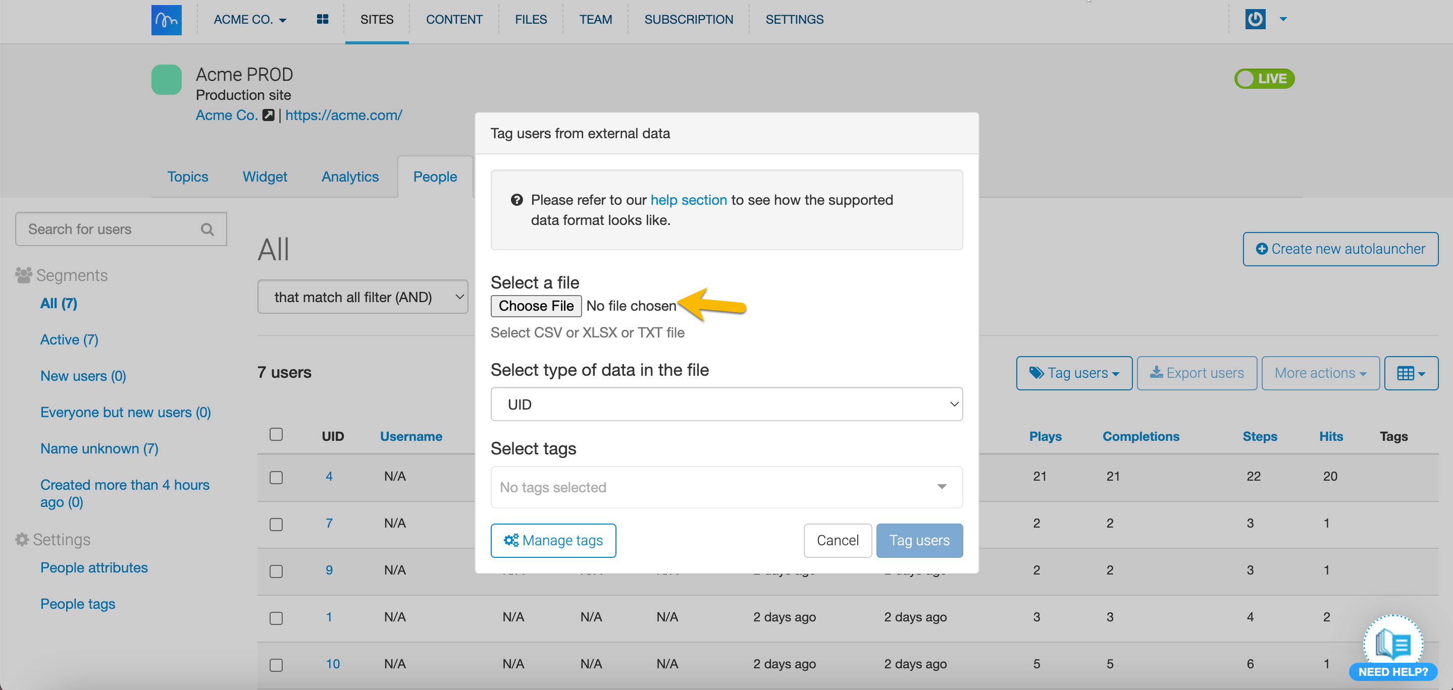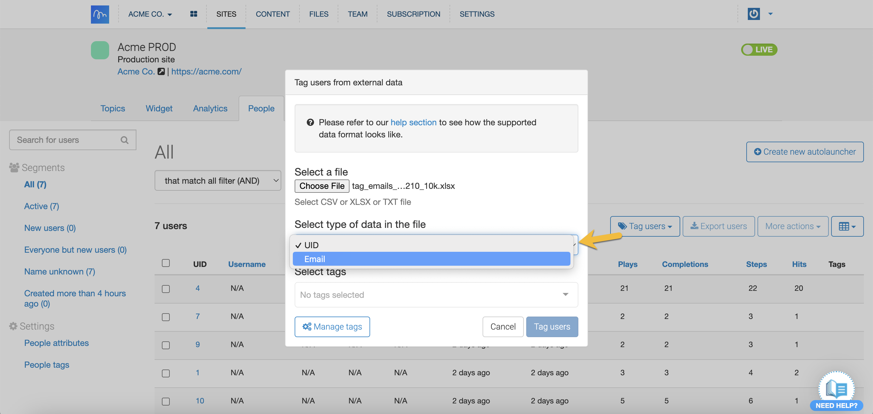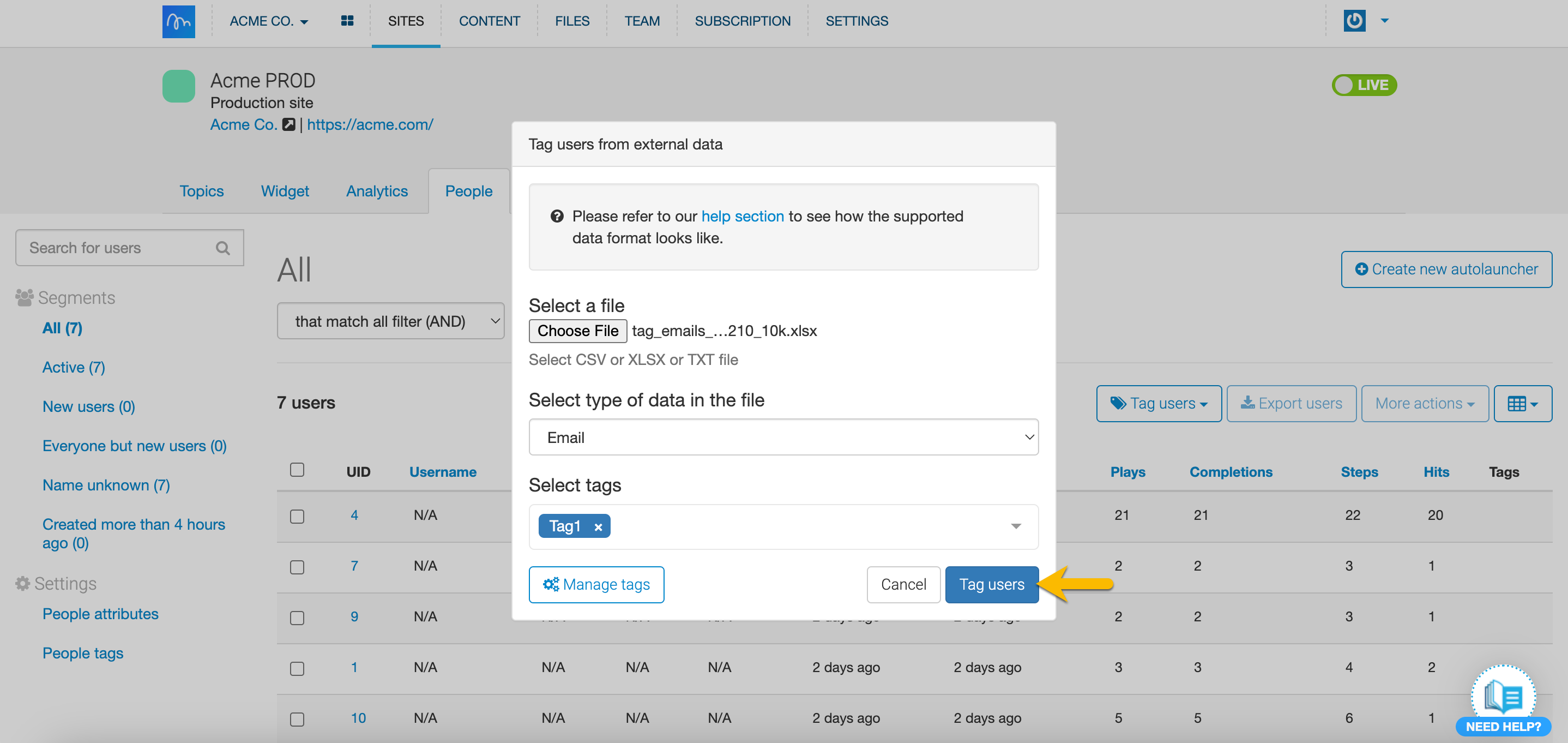 To get started, you'll need a file (CSV, XLSX or TXT formats only) with the emails or UIDs of the users you want to tag. Inline Manual will read only the first column of the document. The other columns will be ignored.
